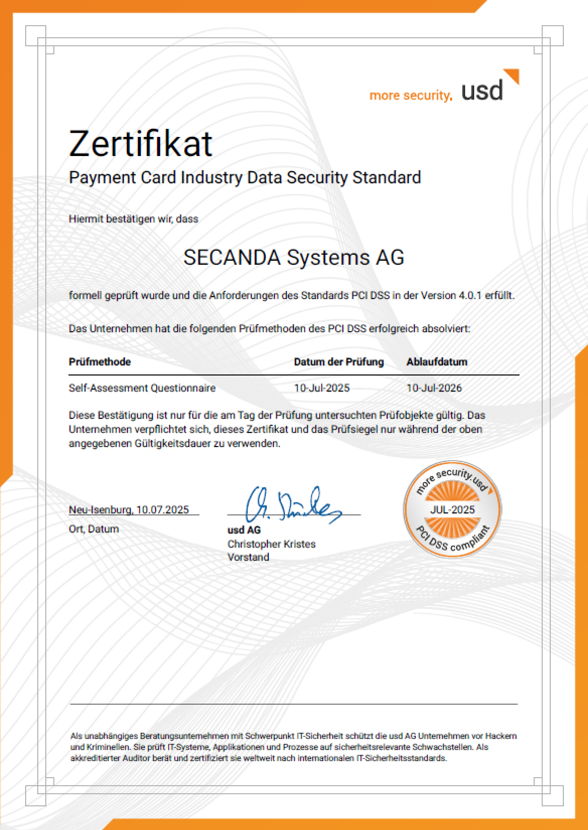 Das Payment Card Industry Data Security Standard (PCI DSS) Zertifikat bestätigt, dass die SECANDA Systems AG die Sicherheitsstandards erfüllt, die von der Payment Card Industry Security Standards Council (PCI SSC) festgelegt wurden. Diese Sicherheitsstandards sind speziell für die Verarbeitung von Kreditkarten- und Zahlungskartendaten entwickelt, um sicherzustellen, dass sensible Informationen wie Kreditkartennummern, Verfallsdaten und Sicherheitscodes geschützt werden und das Risiko von Datenverletzungen minimiert wird.